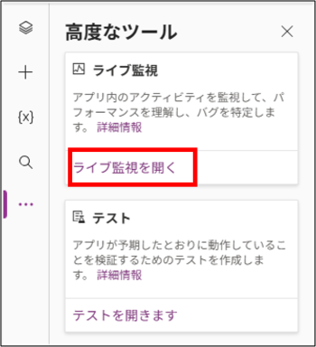 - アプリ一覧画面から、任意のアプリの「…」メニューを表示し、「詳細」内の「ライブ監視」を選択します