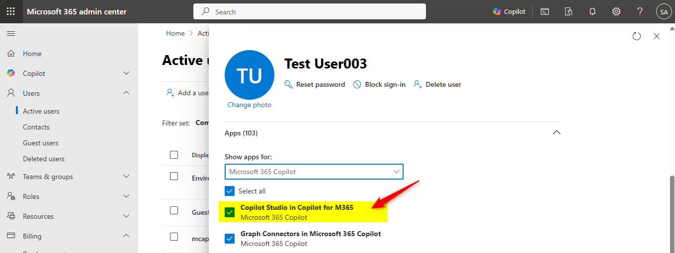Copilot Studio にアクセスさせるためには、「Copilot Studio in Copilot for M365」サービスを有効にする必要があります。