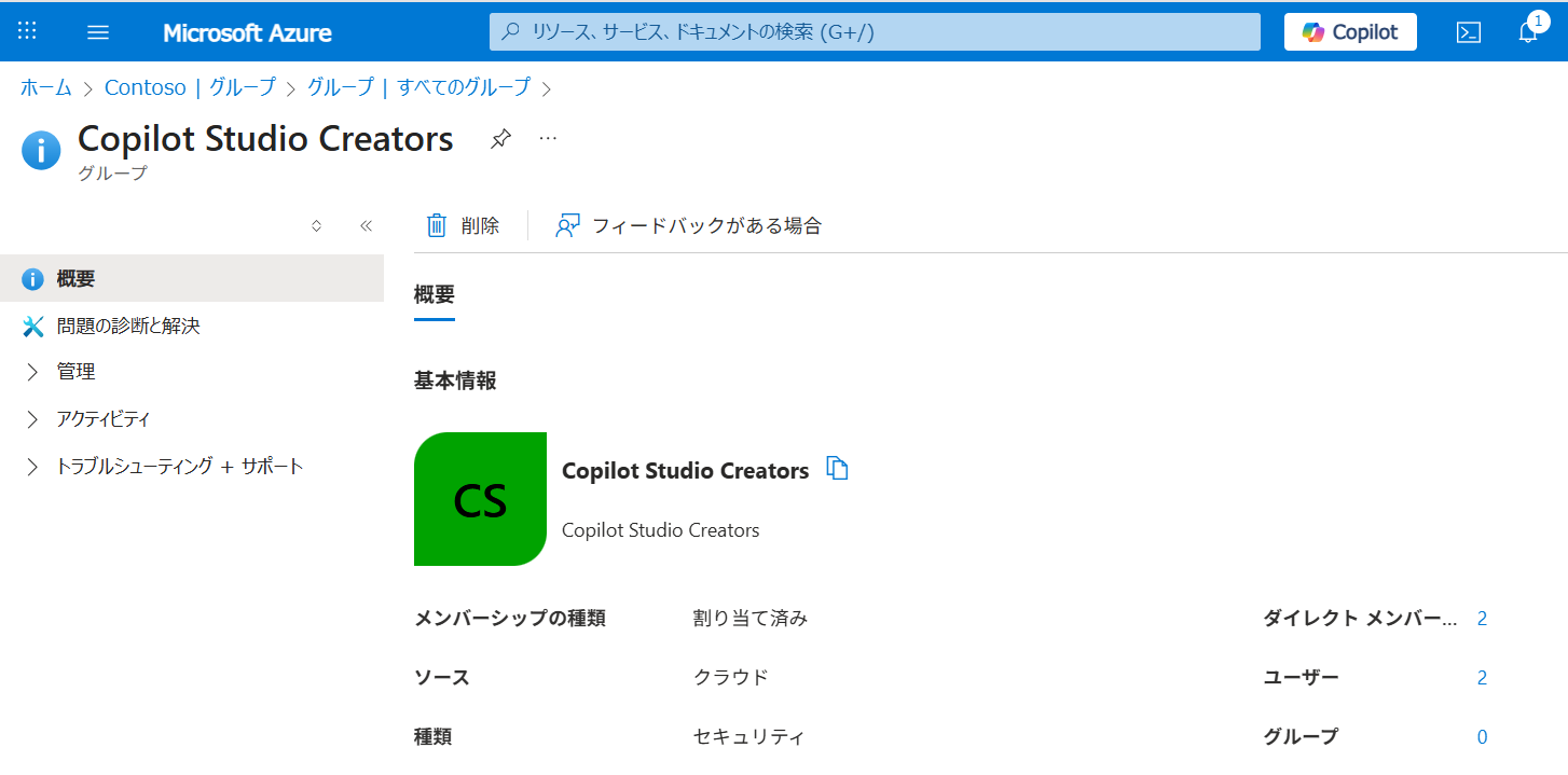 - Copilot Studio へのアクセスを許可したいユーザーをセキュリティグループに追加します。