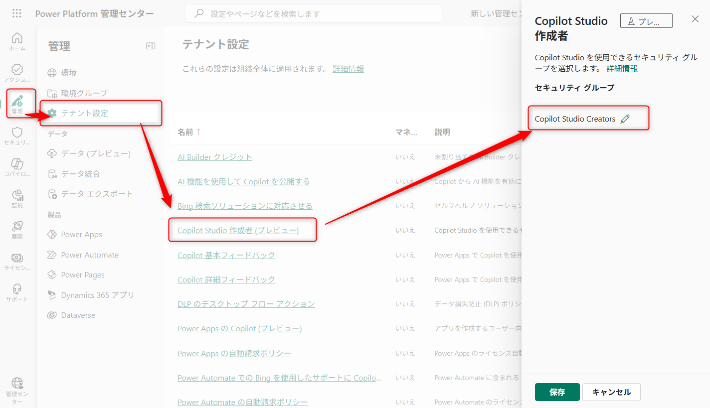 - Power Platform 管理センター テナント設定の「Copilot Studio 作成者」ロール