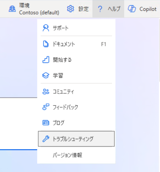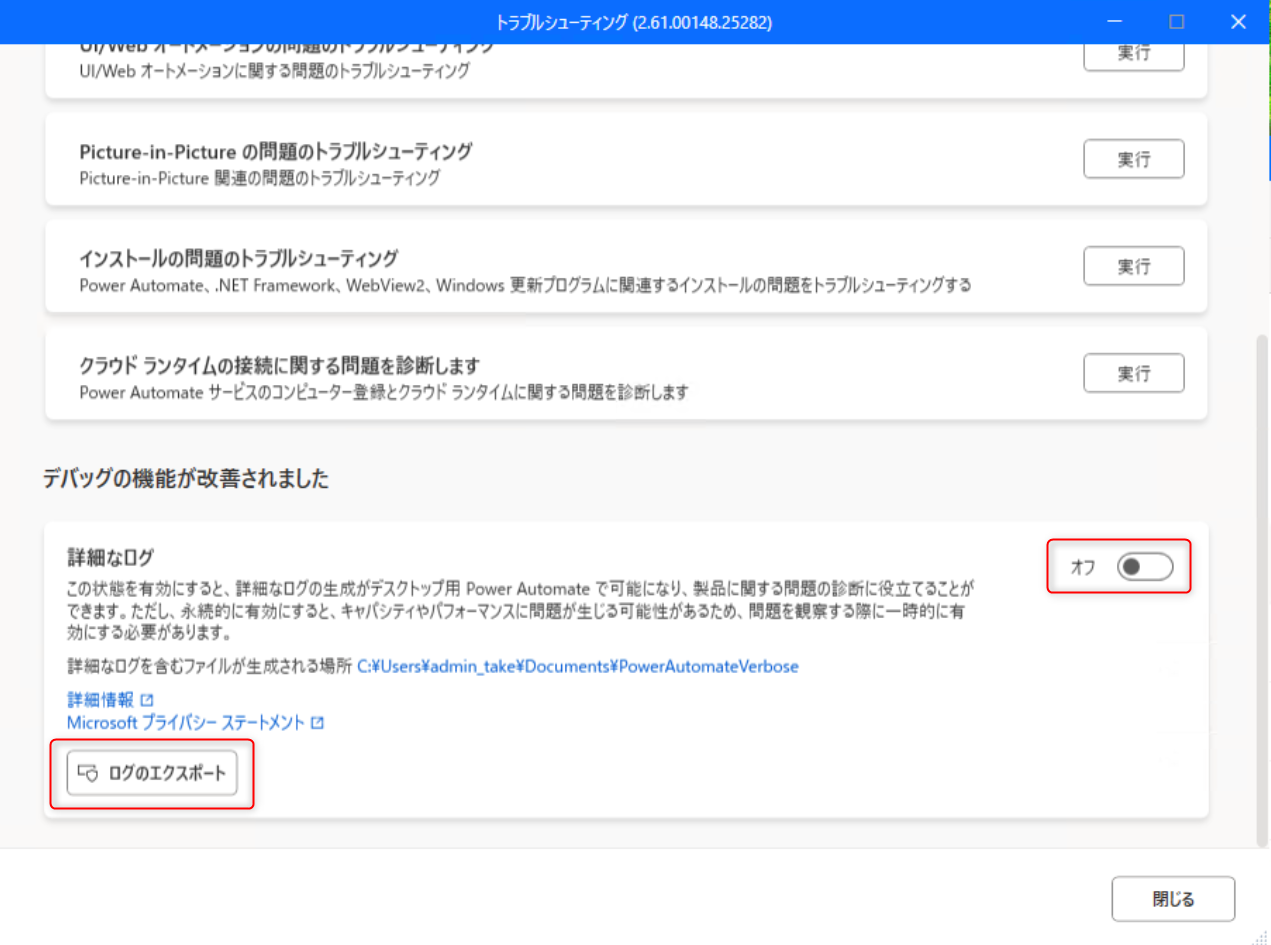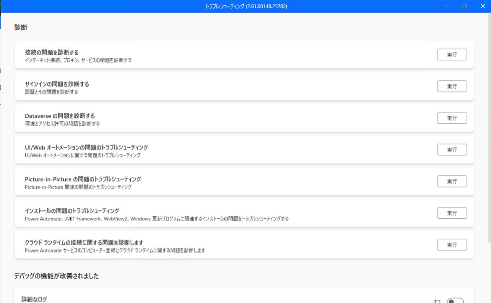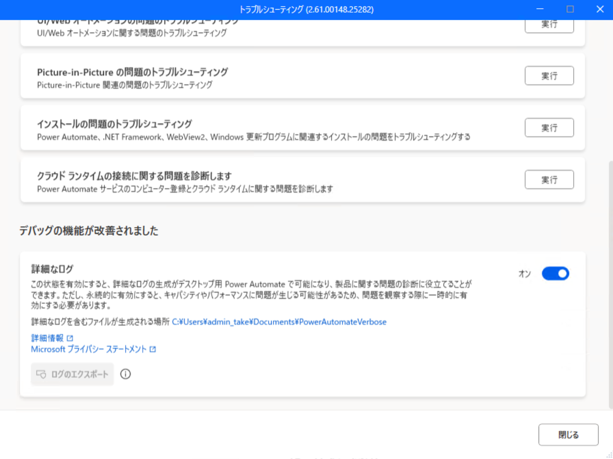- Power Automate for desktop > ヘルプ > トラブルシューティング を選択します。