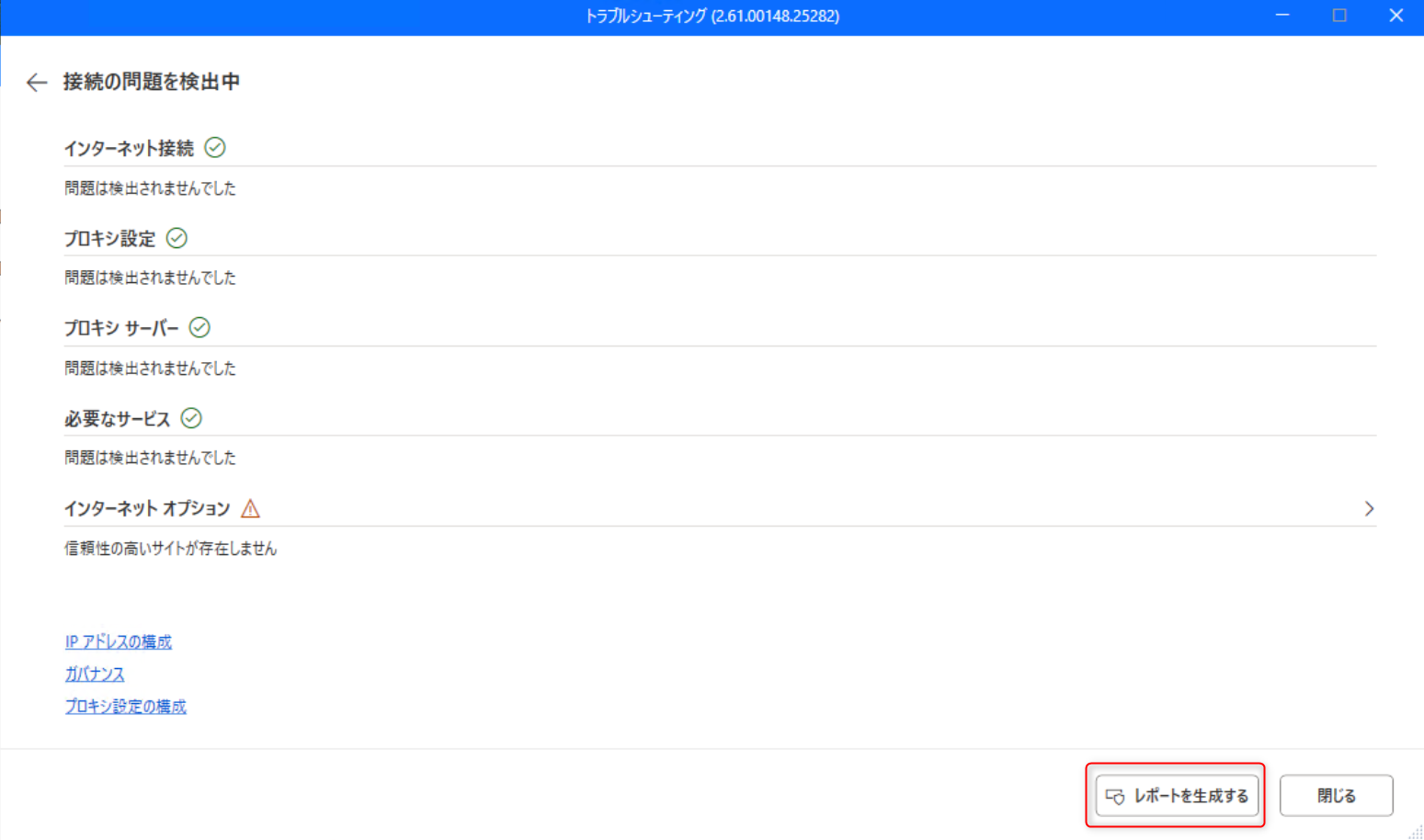 - 表示された画面のスクリーンショットおよび画面右下部から生成されるレポートCSVファイルをご提供ください。