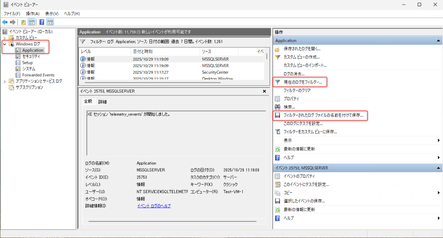 画面右部 “フィルターされたログ ファイルの名前を付けて保存…” から保存された evtx ファイルをご提供ください。