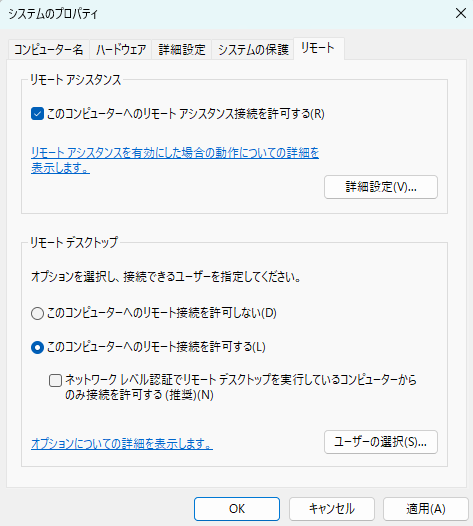実行する端末 > システムのプロパティ > リモート デスクトップにて、以下のように設定します。