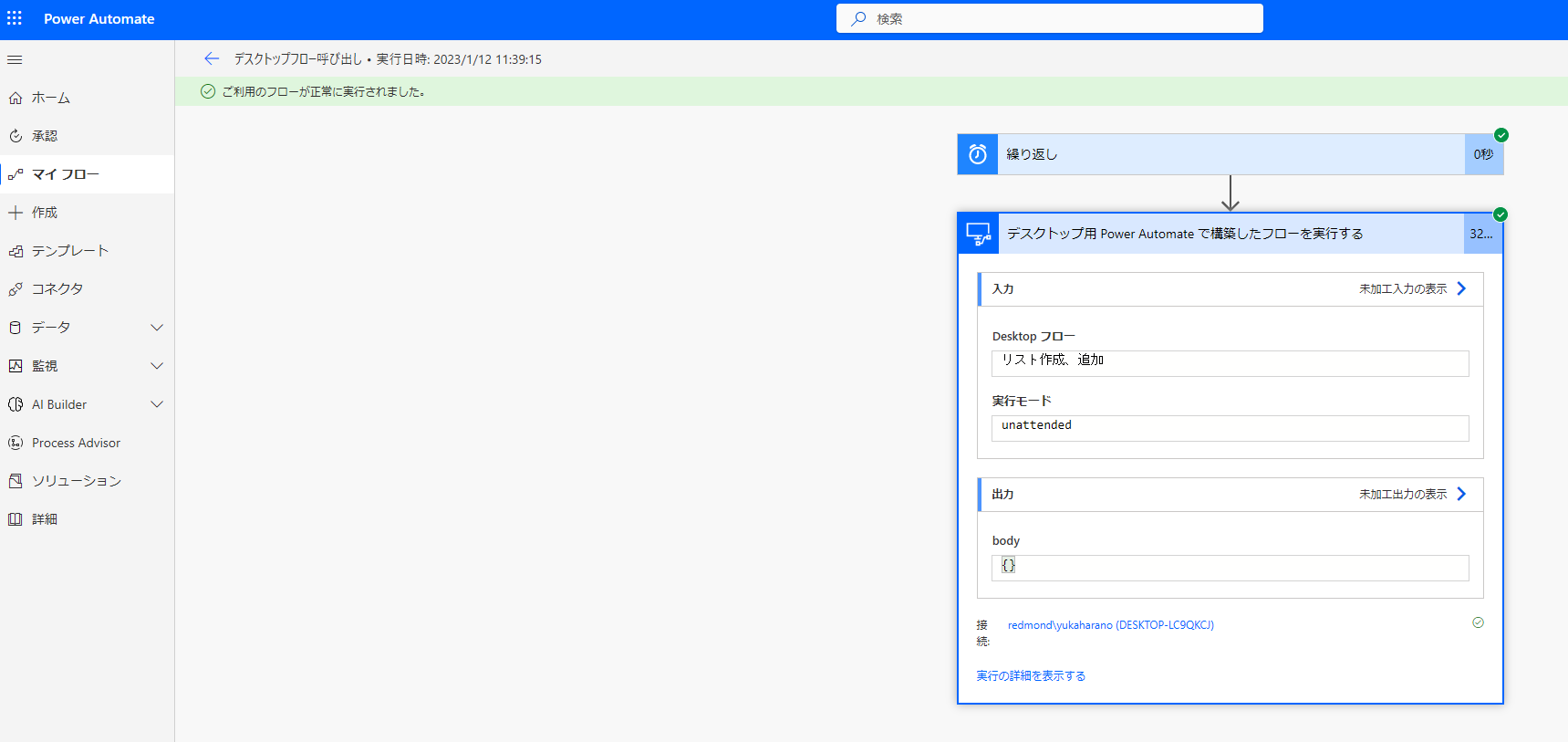 クラウド フローからデスクトップ フローを呼び出して無人実行することができました。