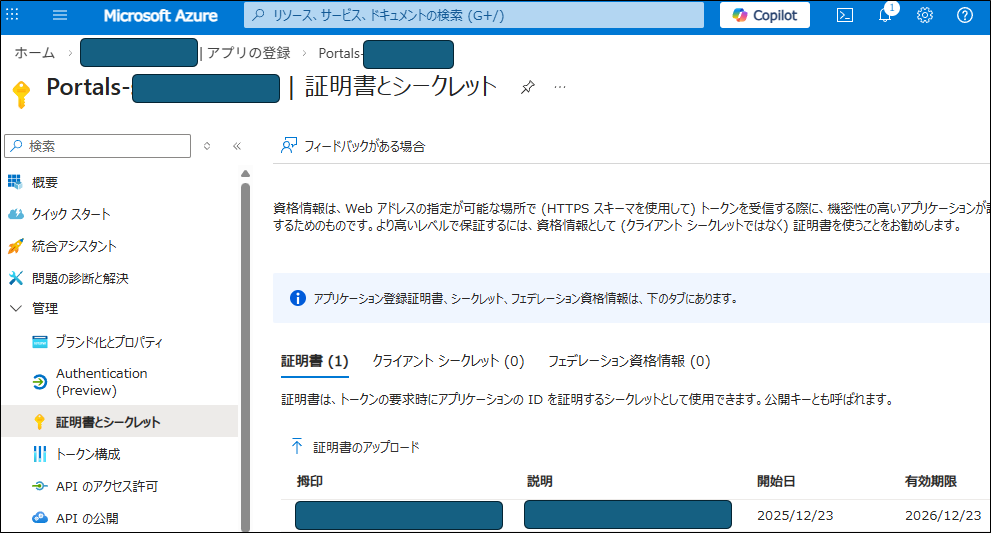 このことから、Power Pages 認証キーの実体は Azrure から確認出来るアプリケーションに紐づく「証明書」と同様となります。