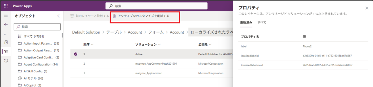 アクティブレイヤーを削除すると下位のマネージドソリューションの動作に戻ります。