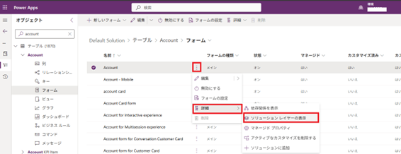 - 対象のコンポーネント(例:フォーム、ビュー、テーブルなど)右側にある三点リーダー(︙) をクリックし、「詳細」->「ソリューション レイヤーの表示」を選択