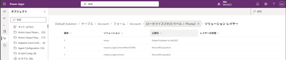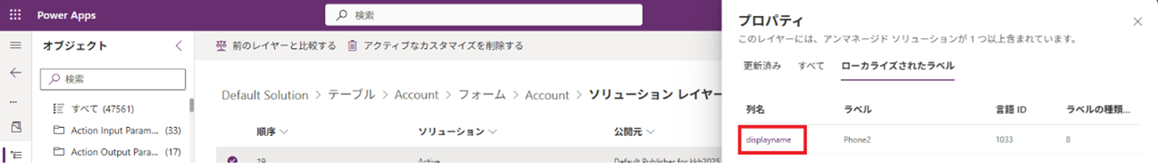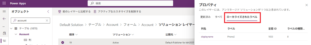 - ローカライズラベルの列名リンクをクリックすることで、ローカライズラベルのソリューションレイヤーも確認できます。
