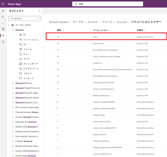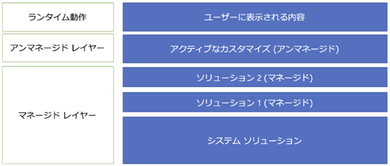 アクティブレイヤーは上記図のアンマネージドレイヤーであり、環境で直接行ったカスタマイズと環境にインポートしたアンマネージドのソリューションを組み合わせたカスタマイズの層を指します。