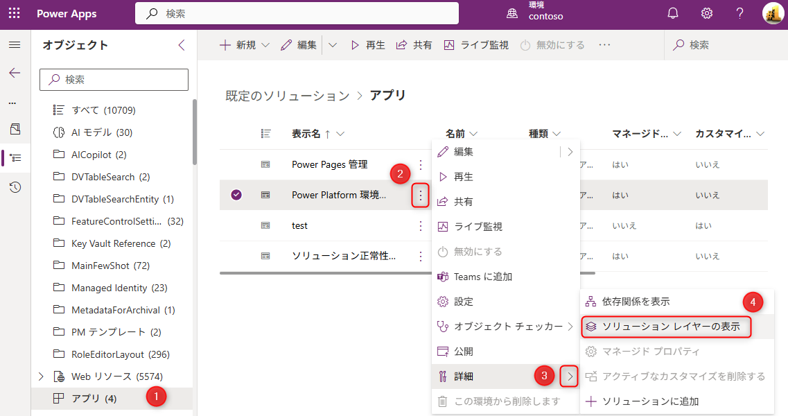 - 左ペインのオブジェクト一覧から対象のコンポーネントの種類を選択します(例: モデル駆動型アプリの場合は [アプリ])