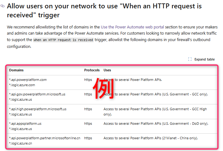Power Automate の IP アドレスの構成 の ネットワーク上のユーザーが “HTTP 要求が受け取った時” トリガーを使用するのを許可する セクションに記載されているドメインを許可してください。