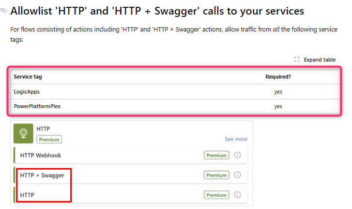 Power Automate の IP アドレスの構成 の サービスへの ‘HTTP’ よび ‘HTTP + Swagger’ 呼び出しを許可リストに載せる セクションに記載されているサービスタグを許可してください。 - HTTP 要求受信時トリガー等、対向サービスからの要求を受信する組込トリガー