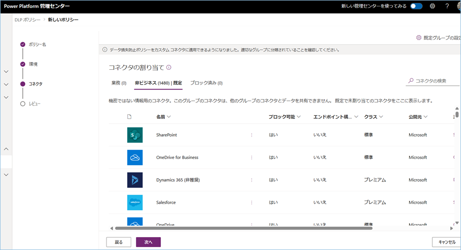 具体的には、「社内データは SharePoint や Outlook などのビジネスコネクタだけと連携可能」や、「SNS系コネクタは使用禁止」というルールを設定できます。