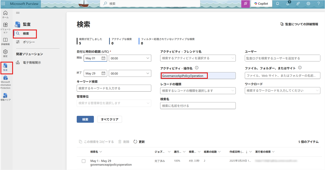 - 「監査>検索」を選択し、「アクティビティ – 操作名」に「GovernanceApiPolicyOperation」を入力してください。