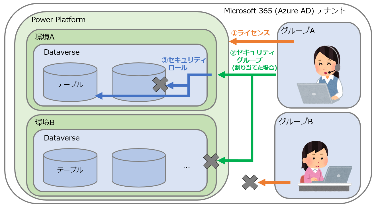 グループ B 内のユーザーは、今回の図の場合ライセンスを所有していないため、Power Platform 製品を利用できません。 - セキュリティ グループ :