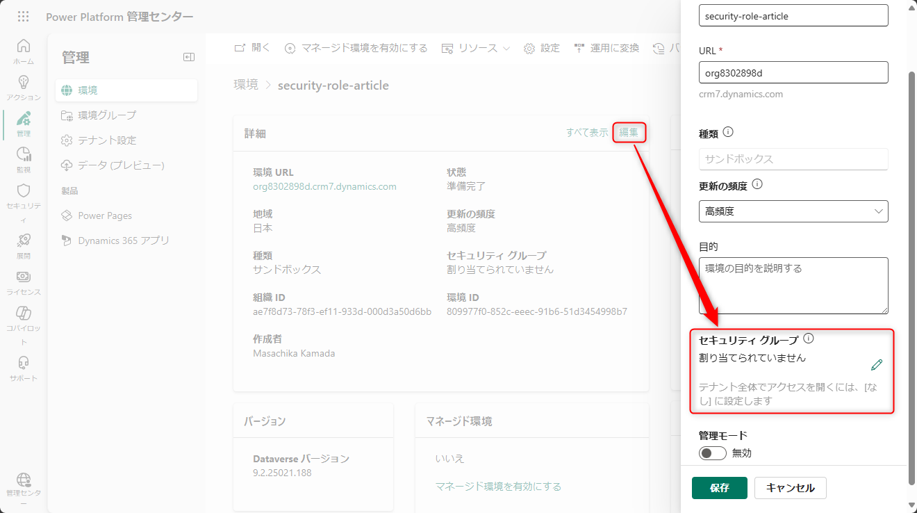 セキュリティ グループの割り当ては、環境作成時にオプションで指定できる他、Power Platform 管理センターから既存の環境に対しても指定できます。